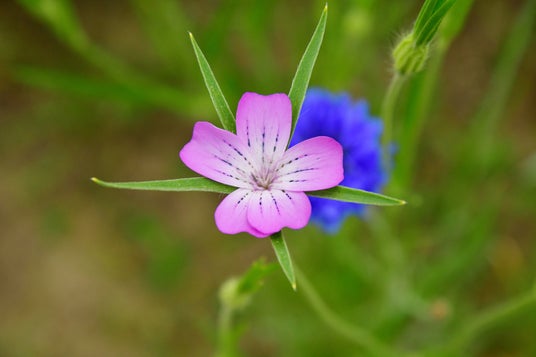 アグロステンマは、風に揺れるようなやわらかな草姿と、可憐で美しいピンクの花が魅力です。青を基調としたヤグルマギクの花畑の差し色となるよう播種しました。名前はギリシャ語の「agros(畑)」と「stemma(王冠)」に由来し、野原に咲く花冠のような愛らしい姿から名づけられました。