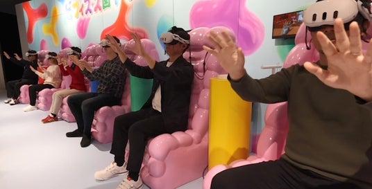 ひときわ異彩を放つ森永乳業ブースで「VR腸内クエスト」を体験中の様子