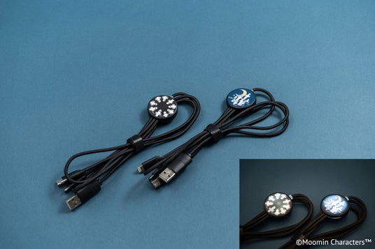 ニョロニョロ フラッシュマルチ充電ケーブル複数のコネクタに対応したマルチ充電ケーブル。給電中はデザイン部分が光り、まるで電気エネルギーで光るニョロニョロみたい。ケーブルを束ねられるバンド付きで持ち運びにも便利です。