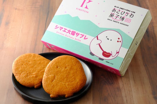 あさひかわ菓子博2025 コラボ「シマエ大福サブレ」あさひかわ菓子博2025 公式キャラクターのシマエ大福をサブレにしました。北海道産小麦の香り、てんさい含密糖のコクが広がります。こんがりとした焼き色、サクっとした食感のやさしいおいしさです。