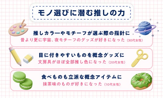 ふとしたきっかけで手に取ったアイテムも、推しカラーだったり、推しを連想させるモチーフだったりするだけで、特別な意味を持つものに変わる…そんな、推しの力を改めて感じる調査結果となりました。