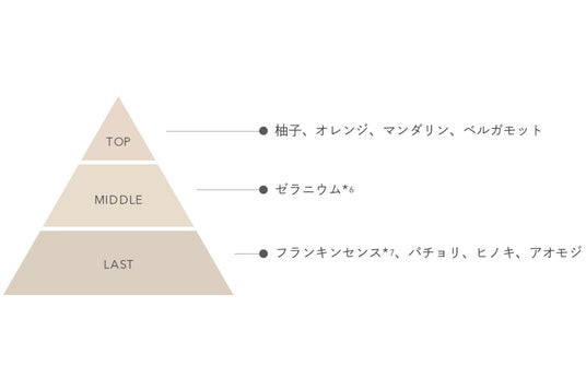 柚子を基調に、ゼラニウム*⁴やパチョリ、オレンジ、ベルガモット、フランキンセンス*7、ヒノキといった、樹木や果実、葉から抽出した精油を9種類ブレンド。実ったばかりの柚子のような清らかさをトップノートに、ウッディな落ち着き、そして凛とした余韻が残る、香りの奥行きをお楽しみいただけます。
