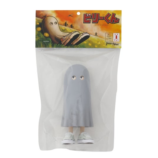 そんなユニークな背景を持つビリー君が、今回初となるコラボレーションでフィギュア化され、 特徴的なアンニュイな目元や、ふわりと揺れるシーツの質感、そして足元にはMaison MIHARA YASUHIROの代名詞とも言えるオリジナルソールスニーカーが、ソフビとして細部まで忠実に再現されています。フィギュア本体は、コレクター心をくすぐるユーモアあふれる専用パッケージ入り。Peace and AfterとMaison MIHARA YASUHIRO、両ブランドのロゴがあしらわれ、コラボレーションを象徴する仕上がりとなっています。
