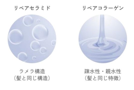 肌への浸透※4力が高いスキンケア保湿成分を、髪の外側・内側と もに浸透しやすい構造へと変化させた「リペアセラミド※5」と「リペアコラーゲン※6」を配合。深いダメージ髪も芯までうるおいで満たし、髪内部まで補修します。