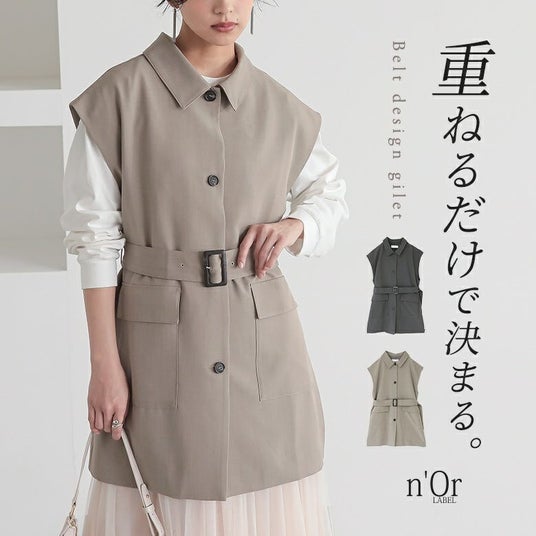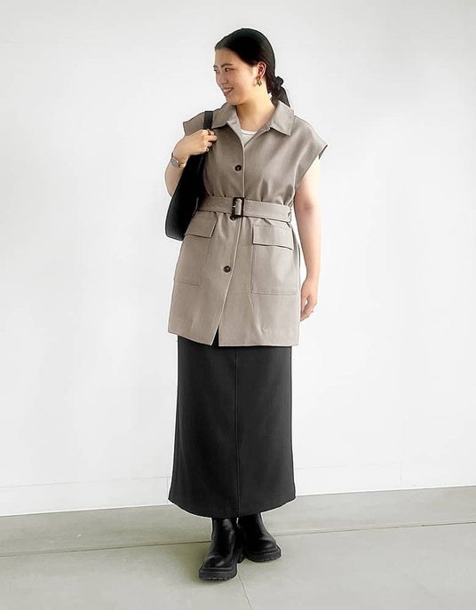 ジレはボタンを1つ開けてVネックにし、付属のベルトでウエストマークをすることでスタイルアップ。