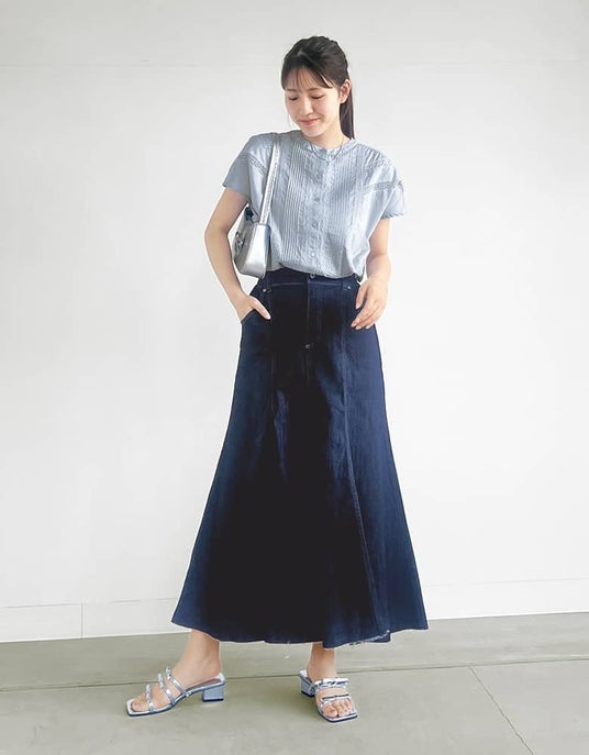 得意のマーメイドシルエットのスカートをハイウエストで穿いて重心を上げるのがポイント。