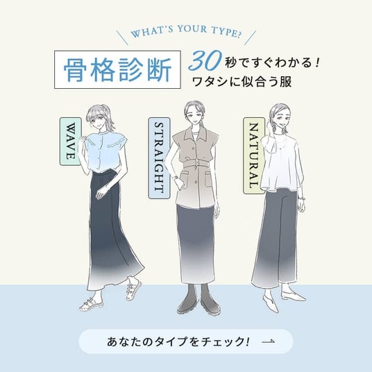 「似合う服がわからない…」というお客様のお悩みを解決するため、簡単な質問に答えるだけで骨格診断ができるコンテンツを公開!タイプ別のおすすめコーデ・アイテムもご紹介いたします。
