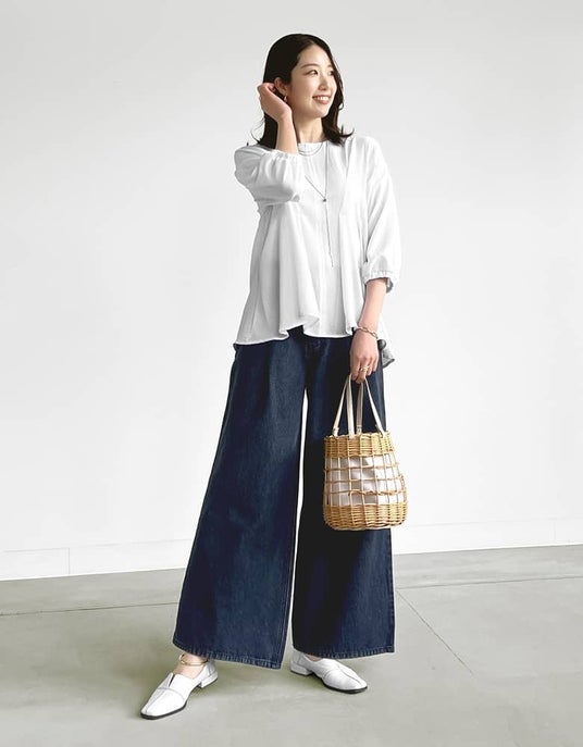 ペプラムトップスにワイドシルエットのタックデニムパンツで、重心を下げたスタイルに。