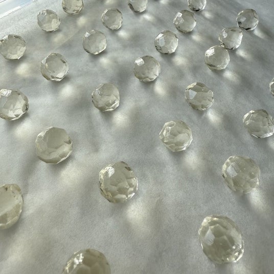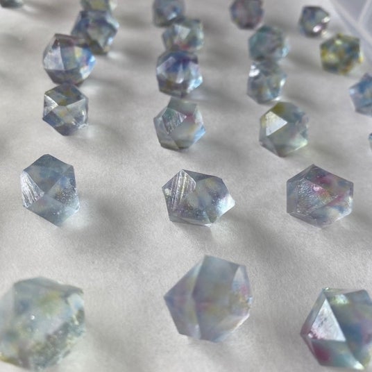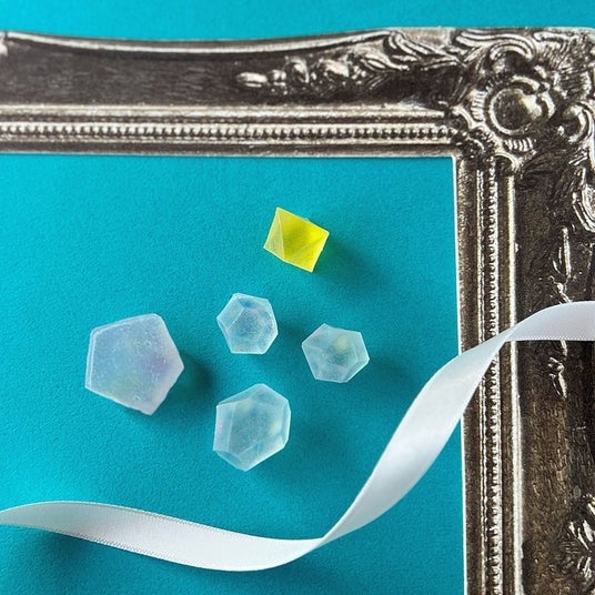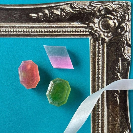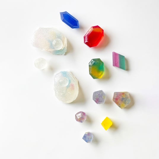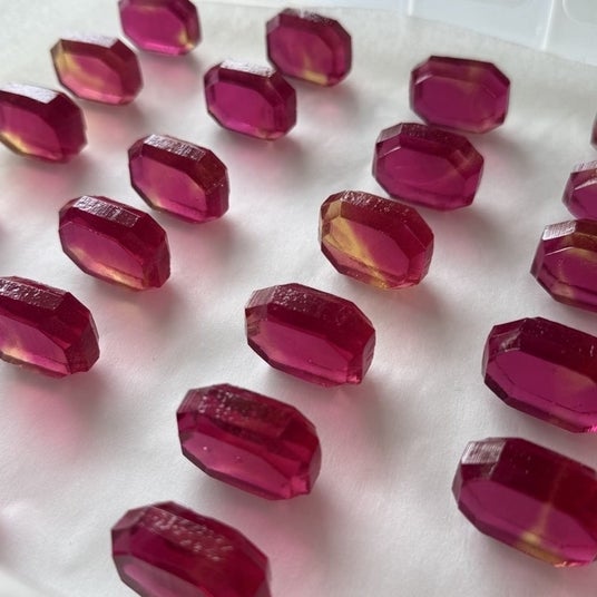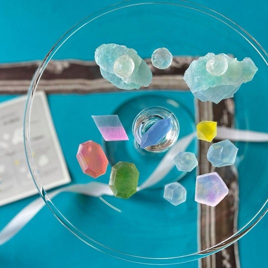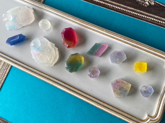 砂糖と寒天からできた和菓子の一種、琥珀糖。「こうぶつヲカシ」はこれに鉱物や宝石のイメージを加えた、アート作品のようなお菓子です。石の美しい佇まいを想像しながら、ひとつひとつ職人の手で切り出しており、どれひとつとして同じものはない唯一無二の作品が出来上がります。また、天然由来の色素を使った繊細な色のグラデーションの表現や、リキュールや果汁を使った多彩な味のバリエーションもこうぶつヲカシならではの魅力のひとつです。こうぶつヲカシという名前は、大好物と鉱物をかけ、いとをかしなお菓子として名づけられました。
