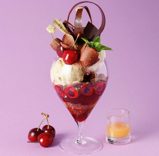アメリカンチェリー×バニラ×ピスタチオ、アクセントにビターなチョコレートをトッピングしたパフェ。