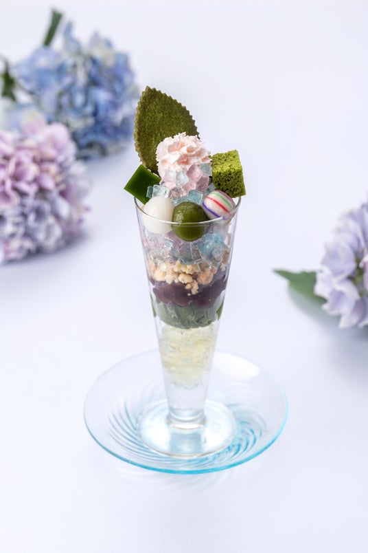涼しげな錦玉羹(きんぎょくかん=寒天で作った和菓子)を散らし、きらきらと輝く紫陽花を表現したパフェ。