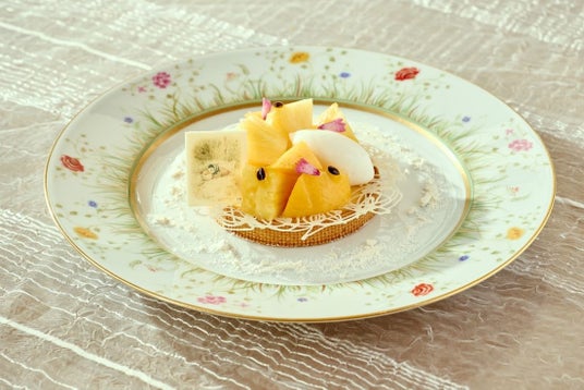 レモンカードとミルクチョコレートムースを組み合わせたタルトにトロピカルフルーツを沢山使用しジマイマのすごもりをイメージしたデザート。