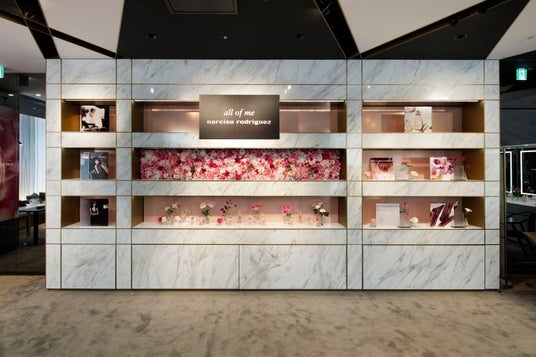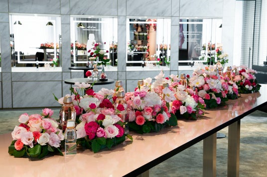 フローラルフレグランスの新しい解釈を象徴するピンクのボトルの印象的な展示