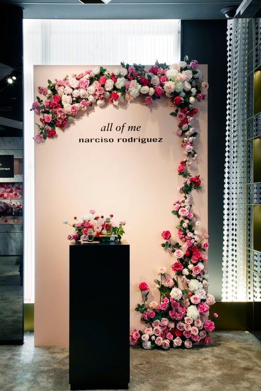 『オールオブミー ナルシソ ロドリゲス』が提案する新しいローズの概念の基調ともなる、南仏のグラースで夜明けに手摘みされたセンティフォリアローズと、通常はメンズフレグランスに使用されることの多いゼラニウムブルボンの大胆な組み合わせをイメージした会場に、集まったプレスやフレグランス有識者、インフルエンサー等が、調香師のクリエイティブストーリー動画や、「光の魔術師」と称される写真家 ソルベ・スンツボによるキャンペーン動画などを、ブランドの世界観と共に存分に堪能する機会となりました。