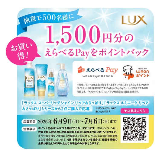 発売と同日の2025年6月9日(月)より「ラックス リペア&さっぱり シリーズ」を対象とした店頭キャンペーンを実施します。期間中、対象製品を1点以上購入いただき、専用アプリからレシートでご応募いただくと、抽選で合計3,500名様に最大1,500円分のえらべるPayが当たるお得なポイントバックキャンペーンです。夏のヘアケアをスタートする絶好のチャンスに、ぜひ奮ってご応募ください。