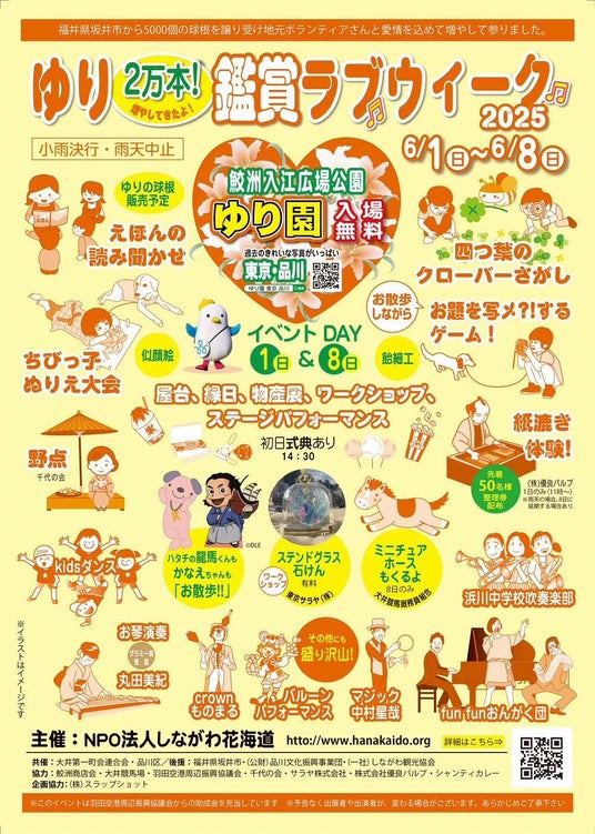 6月1日と同8日には屋台、縁日、物産展、ワークショップ、ステージパフォーマンスなどの「ゆりイベント」が行われ、会場を盛り上げます(小雨決行・雨天中止)。