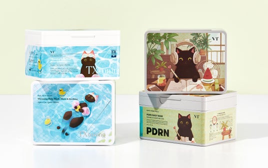 また、可愛い猫の絵で人気のイラストレーター、イムデュイさんとのコラボ第2弾も実現!夏らしく、黒猫がプールに入ったり、夏休みの宿題をしている様子を描いたイラストの商品を発売します。VTの人気商品である30枚入りの箱型マスクには、思わず買いたくなる可愛さのコラボデザインがプリントされた限定版も。