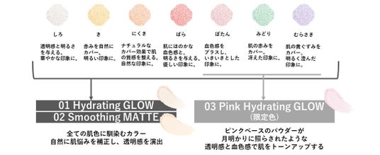 01 Hydrating GLOW:セミつや肌/02 Smoothing MATTE:セミマット肌に。