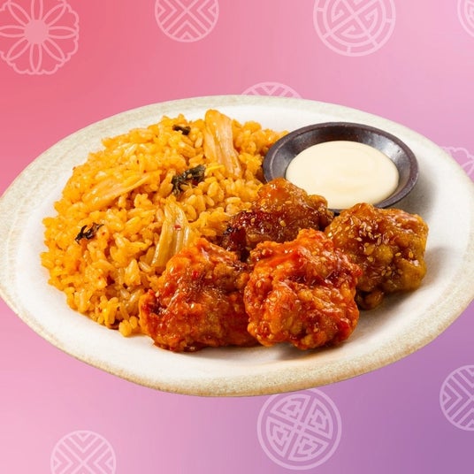 キムチ炒飯に甘辛い味わいの「ヤンニョムチキン」と醤油で味付けした「カンジャンチキン」を組み合わせ。味変の特製チーズソースをつけてお召し上がりください。