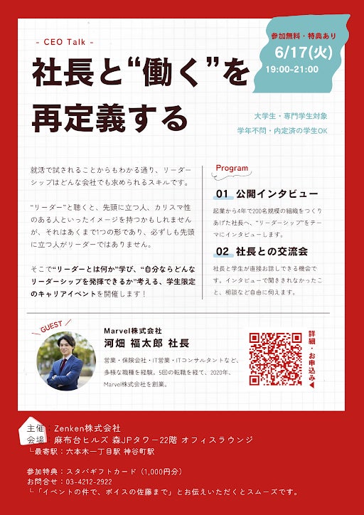 Zenken株式会社(本社:東京都港区、代表取締役社長:林 順之亮、以下 Zenken)は、2025年6月17日、経営者と学生の交流イベント「CEO Talk」(シーイーオートーク)を無料開催いたします。