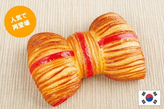 サクサクのクロワッサンがストロベリー風味の生地でリボンの形に大変身♪とってもキュートな見た目は写真映え間違いなし!中にはカスタードクリーム入り。