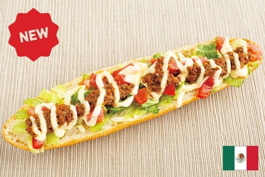 メキシコ料理の定番「タコスミート」をパンでアレンジ♪カットしたフランスパンにレタス、トマト、マヨネーズ、チーズとともにピリ辛でスパイシーなタコスミートをのせて焼き上げました。