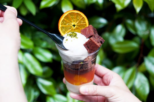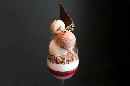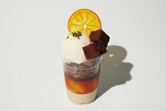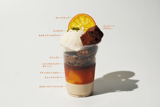 はじめはアイスクリームやブラウニー、ガナッシュの層でしっかりとしたカカオの風味を味わい、中盤ではゼリーやコンポートによる柑橘の爽やかさを、そして最後はカカオハスクが香るパンナコッタのやさしい甘さで締めくくります。