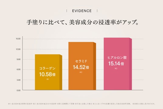 また、電流の導電率を高める新開発のニーディングボール形アタッチメントを使えば、美顔器としても活躍。美容成分浸透*⁴効果試験では、手塗り時と比べて、「ヒアルロン酸」は15.1倍*⁸、「セラミド」は14.5倍*⁸、「コラーゲン」は10.6倍*⁹と、有意な浸透率の向上が確認されました。