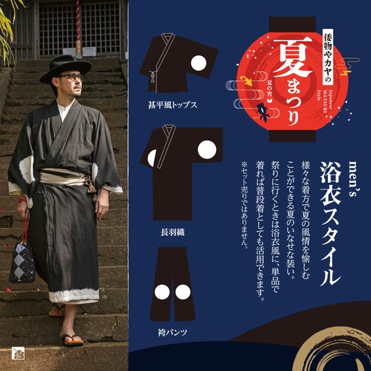 「倭物やカヤ」のメンズ着流しは、浴衣としても羽織としても使える2WAY仕様。帯を巻けば粋な浴衣に、ラフに羽織れば夏の軽アウターとして活躍します。