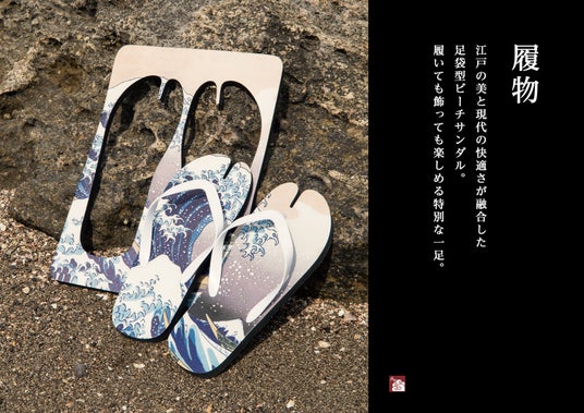 浮世絵デザインのビーチサンダル、粋な下駄、動きやすい地下足袋など、多彩にご用意しています。和装に合わせて、足元までこだわりを。