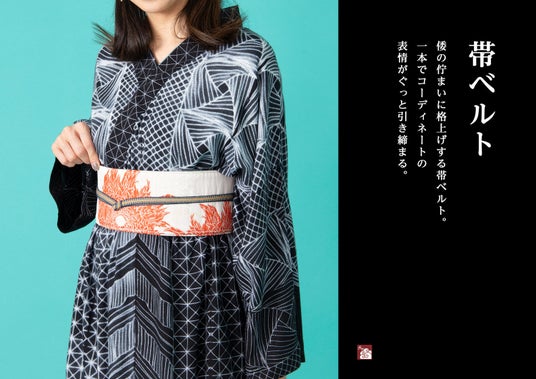 巻いて紐を結ぶだけ、ベルト感覚で自由に帯をスタイリング。簡単に着付けができるのが魅力。長時間着用しても苦しくならず、ファッションとしての自由度と快適性を兼ね備えています。