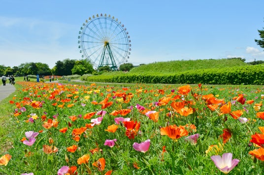 国営ひたち海浜公園は、茨城県ひたちなか市の太平洋岸にあり、春のネモフィラ、スイセン、チューリップ、初夏にはポピーやバラ、夏のジニア、ヒマワリ、秋にはコキア、コスモス、冬のアイスチューリップなど、彩り豊な花々が四季を通じて楽しめます。また、海抜100mからの眺望を楽しめる大観覧車をはじめ、ジェットコースターなど多彩なアトラクションが揃う遊園地「プレジャーガーデン」のほか、林間アスレチック広場やバーベキュー広場など、食事・スポーツ・ピクニック・・・遊び方は十人十色。魅力いっぱいの公園で、思い思いの時間をお過ごしください。