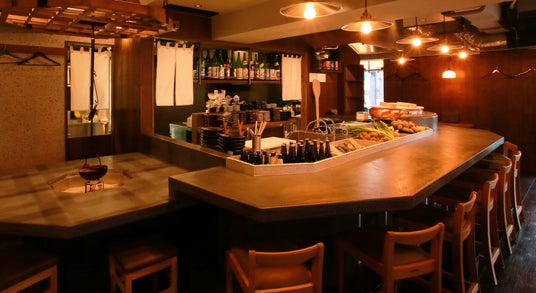 当店は、1階と2階でそれぞれ異なる雰囲気をお楽しみいただける店舗で、1階は白とライトブラウンを基調とした、明るくカジュアルで親しみやすい雰囲気。一方、2階は炉端焼きの焼き台を設け、ダークブラウンを基調とした落ち着いた雰囲気が広がります。同じ店舗内でありながら、まったく異なる空間をお楽しみいただけます。また、1階・2階ともに大きなおでん鍋を設置しており、おでん鍋を眺めながら楽しめるカウンター席をはじめ、幅広いシーンにも対応可能なテーブル席をご用意。お好みの雰囲気の中で、ゆったりとしたひとときをお過ごしいただけます。