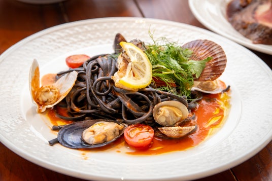 ・鮮魚のポワレと3種の貝のペスカトーレ 甲殻類のソースとハーブ、レモン / イカ墨を練り込んだリングイネ