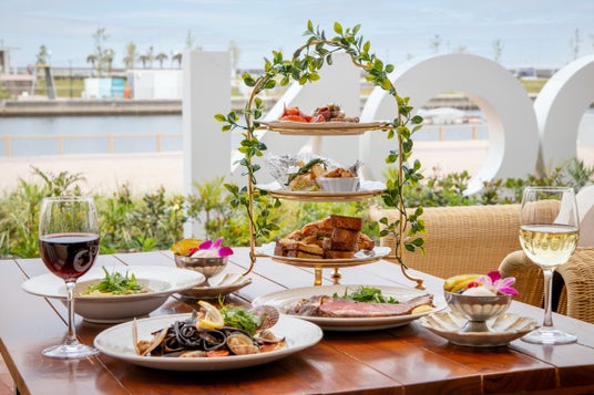 彩り豊かなお料理はもちろん、LAGOONビーチや明石海峡大橋を望む開放感溢れるテラス席からの絶景ロケーションがリゾート感を演出します。