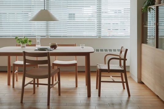 イタリア語で“小さな食堂”を意味する「CANTINETTA」シリーズは、現代日本のダイニング空間が和と洋の要素が調和した独自のスタイルへと進化しているという武内の考察に基づき、空間に主張しすぎることなく溶け込むニュートラルなデザインを追求して開発されました。デザインの原点となったのは、 2015年に廃番となるも今なおカリモク家具の工場の食堂で実際に使われているチェア「CS1105」。その力強く安心感のある太めのシルエットや、シンプルながらも愛らしいデザインからインスピレーションを得て、現代の住環境に調和するよう再構築されました。幅広い空間でお使いいただけるように、チェアはアーム付き、アームレスの2種、座面は張座、板座、ペーパーコードの3種からお選びいただけます。また、テーブルは4つのサイズバリエーションに加え、Φ1100mmの円卓もラインナップ。塗装色は当社のブナ材塗装色オーダーのラインナップに加え、昨年発表した「コットンナチュラル」、また武内と新規で開発した「カンティネッタグリーン」の2色にも対応します。