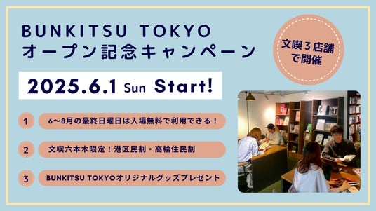 日本出版販売株式会社(代表取締役社長:富樫 建、略称:日販)の子会社である株式会社ひらく(代表取締役社長:染谷 拓郎、以下:ひらく)は、“本と出会うための本屋”「文喫(ぶんきつ)」史上最大規模の店舗面積となる1,000坪超の大型店舗『BUNKITSU TOKYO(ブンキツ トーキョー)』が2025年9月12日(金) ニュウマン高輪に開業することを記念して、2025年6月1日(日)~9月30日(火)の期間、文喫 六本木・栄・福岡天神の3店舗にてお得なキャンペーンを開催します。