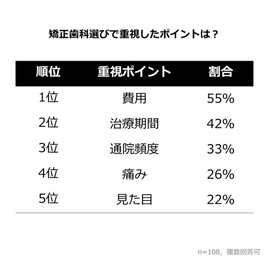 Z世代が矯正歯科医院を選ぶ際に重視したポイントは、「費用」が55%でトップ。続いて「治療期間」(42%)、「通院頻度」(33%)という結果になりました。