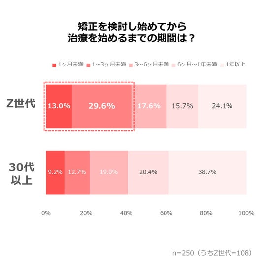 矯正を検討し始めてから実際に治療を開始するまでの期間を調査したところ、Z世代では「3ヶ月未満」で治療を開始した人が42.6%にのぼりました(「1ヶ月未満」13.0%と「1ヶ月~3ヶ月未満」29.6%の合計)。