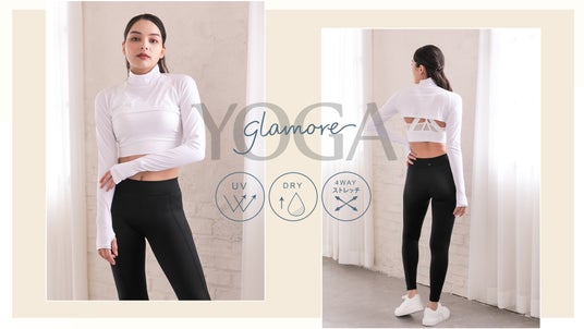 YOGA by glamoreは、汗をかいても素早く吸収拡散し、サラっと快適に過ごせる、希少な日本製の吸水速乾性の高い生地を使用しています。本社のある繊維大国、福井県で作られた高機能素材です。発色性に優れ、色褪せや色移りしにくく、繊細な肌ざわり。ヨガやピラティスといった身体の柔軟性が求められるポーズでも関節の可動域やパフォーマンスを妨げないため、屋内やおうちでのワークアウトにも最適です。