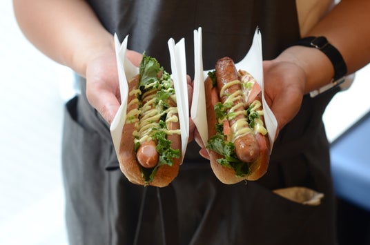 ワサビソーセージとケール、ワサビマヨネーズのホットドック