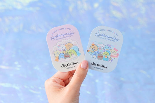 『すみっコぐらしスペシャルスイーツビュッフェ~ぺんぎんラグーン~』 にご来場のお客さまには、1名さまにつきオリジナルステッカーを1枚プレゼント。デザインは2種類ご用意しています(デザインは選べません)。夏休み限定スイーツビュッフェの思い出に、スマホに忍ばせても可愛いデザインです。