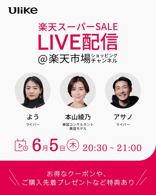 6月5日(木)20時30分~21時00分に楽天市場ショッピングチャンネルにてライブ配信を実施いたします。MCにライバーのようさんとアサノさん、ゲストに美容コンサルタント・美容モデルの本山綾乃さんを迎え、Ulikeの商品の魅力や実際の使用体験談について、ご紹介いただきます。さらに、ライブ配信中に商品ご購入の方限定で、豪華な特典もご用意しております。このお得なタイミングでぜひUlike商品をお買い求めください。