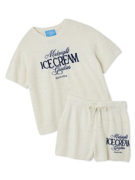 なめらかな‘スムーズィー’素材を使用したニットシリーズ。グラフィカルなメッセージロゴをジャガードで施し、ホワイトはカラースプレーを、ピンクはイチゴの粒感をイメージしたネップでアイスクリームを表現しています。
