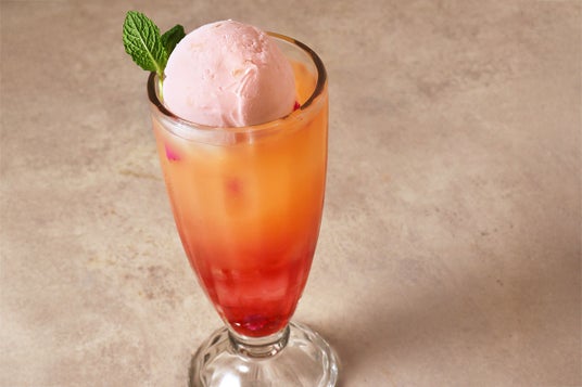 ぶどうジュレとラズベリーの甘酸っぱいドリンク。ピーチソルベを添えた、気分はまるで“Happiness is a warm puppy.. ”