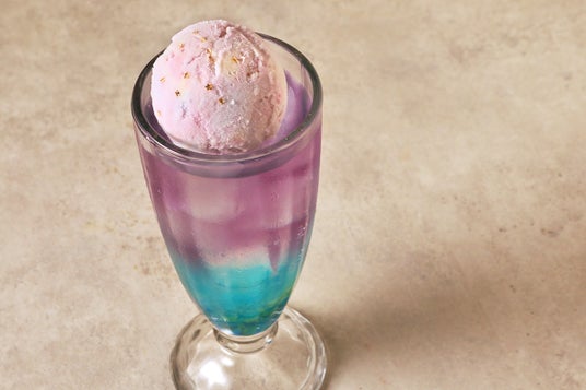 宇宙をイメージさせるブルーとパープルのグラデーションドリンクに月をイメージさせたマーブルアイスをトッピング。