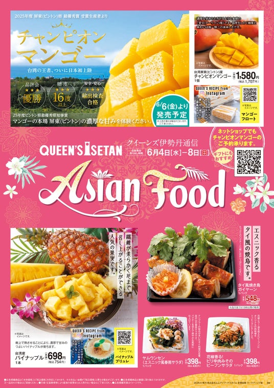 三越伊勢丹のグループ会社で、首都圏を中心に19店舗のスーパーマーケット(クイーンズ伊勢丹)を運営する株式会社エムアイフードスタイル(本社:東京都新宿区、代表取締役社長:雨宮 隆一)は、6月4日(水)~6月8日(日)までの期間限定で、「アジアンフェア」を開催いたします。