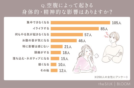 女性が空腹を感じたときに経験する身体的・精神的な症状について尋ねたところ、過半数の女性が空腹により集中力の低下を実感していることが明らかになりました。