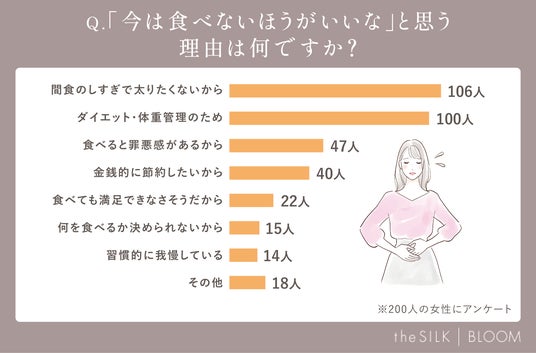 アンケート調査の結果、最も多かったのは「間食のしすぎで太りたくないから」(53.0%)で、次いで「ダイエットや体重管理のため」(50.0%)が続きました。これらの結果から、全体の半数以上の女性が体型維持を最優先に考えていることがうかがえます。