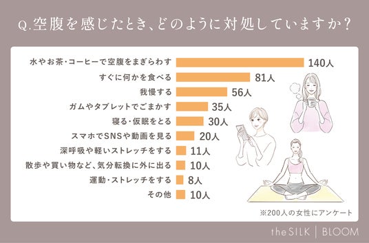 女性200名に実際に行っている空腹時の対処法を調査したところ、最も多く選ばれたのは「水やお茶・コーヒーで空腹をまぎらわす」(140人)で、次いで「すぐに何かを食べる」(81人)、「我慢する」(56人)と続きました。